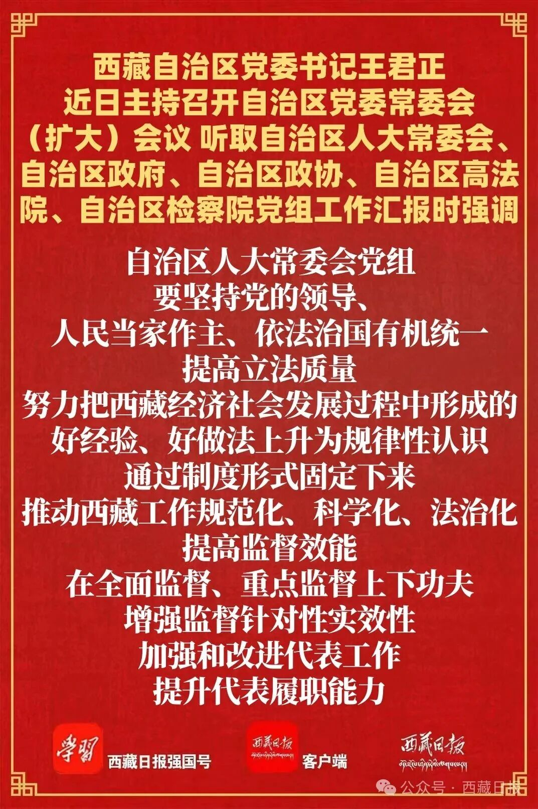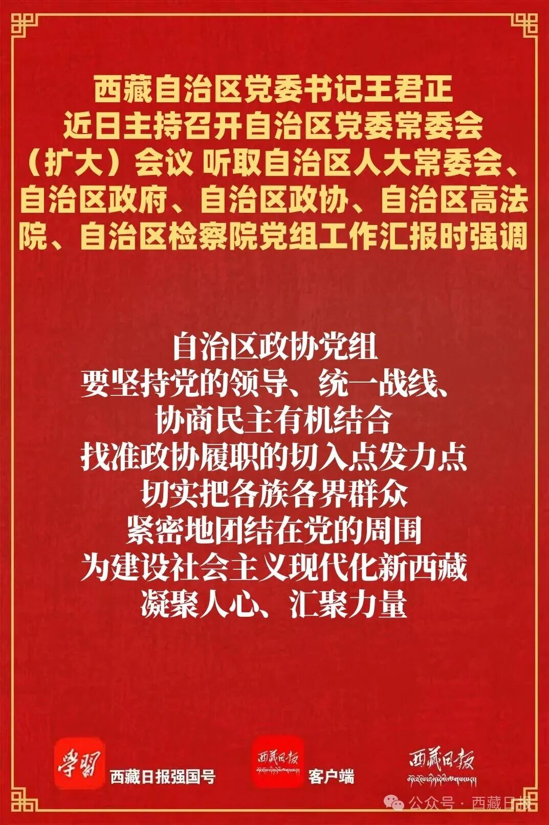 王君正强调,开局关乎全局、起步决定后程,做好2026年工作意义重大。各党组要在以习近平同志为核心的党中央坚强领导下,在自治区党委的团结带领下,统一意志、形成合力,充分发挥把方向、管大局、保落实的领导作用,聚焦“四件大事”聚力“四个创建”,坚定履行职责使命,切实发挥职能作用,努力实现“十五五”良好开局。自治区人大常委会党组要坚持党的领导、人民当家作主、依法治国有机统一,提高立法质量,努力把西藏经济社会发展过程中形成的好经验、好做法上升为规律性认识,通过制度形式固定下来,推动西藏工作规范化、科学化、法治化;提高监督效能,在全面监督、重点监督上下功夫,增强监督针对性实效性,加强和改进代表工作,提升代表履职能力。自治区政府党组要深入贯彻习近平经济思想,完整准确全面贯彻新发展理念,落实“三个赋予一个有利于”总要求,加强前瞻性谋划和整体性推进,服务保障国家重大战略实施,坚持深化改革、扩大开放,进一步优化营商环境,积极发展高原特色优势产业,因地制宜培育新质生产力,确保经济发展当前有活力、未来有潜力。自治区政协党组要坚持党的领导、统一战线、协商民主有机结合,找准政协履职的切入点发力点,切实把各族各界群众紧密地团结在党的周围,为建设社会主义现代化新西藏凝聚人心、汇聚力量。自治区高法院、自治区检察院党组要贯彻落实习近平法治思想,忠实履行法律赋予的职责使命,全面提高司法服务质量,不断提升履职能力和水平,为长治久安和高质量发展作出更大贡献。