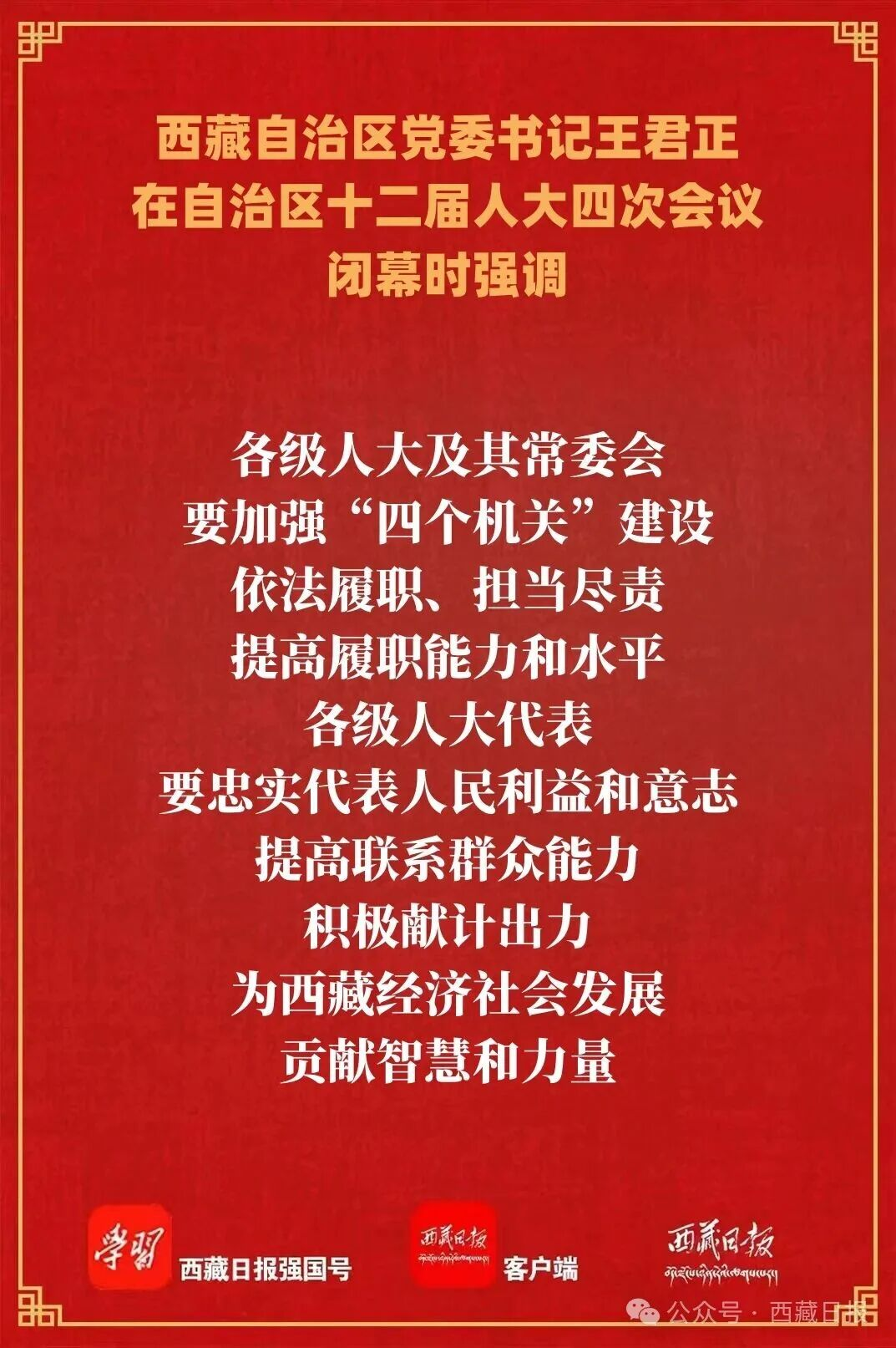 王君正强调,开局关乎全局,起步决定后势。全区各级人大和人大代表要坚持以习近平新时代中国特色社会主义思想为指导,坚决贯彻落实习近平总书记关于坚持和完善人民代表大会制度的重要思想,坚持党的领导、人民当家作主、依法治国有机统一,认真履行宪法、法律赋予的各项职责,推动新时代人大工作高质量发展,努力为全区工作大局贡献更大力量。提高政治站位,坚持把党的领导贯穿人大工作全过程、各方面,保证党的路线方针政策和决策部署得到全面贯彻和有效执行。坚持人民至上,积极发展和践行全过程人民民主,努力使每一项立法、每一个决定决议都体现和维护人民利益、反映人民意愿、增进人民福祉。推进高质量立法,紧紧围绕“四件大事”落实,从“小切口”入手加强立法,科学立法、民主立法、依法立法,深入实施法治宣传教育,为全面依法治藏提供更加完善的法治保障。增强人大监督质效,围绕“十五五”规划实施,增强监督针对性、实效性、科学性,深化人大监督成果运用,切实解决改革发展、社会民生等领域突出问题,积极促进西藏经济社会高质量发展。发挥带头作用,多做宣讲政策、协调关系、增进团结的工作,密切同人民群众的联系,当好党和政府联系人民群众的桥梁,切实把社会各方面的思想和行动统一到党中央关于西藏工作的决策部署上来,统一到自治区党委工作安排和要求上来,广泛凝聚磅礴力量,为建设团结富裕文明和谐美丽的社会主义现代化新西藏而努力奋斗。