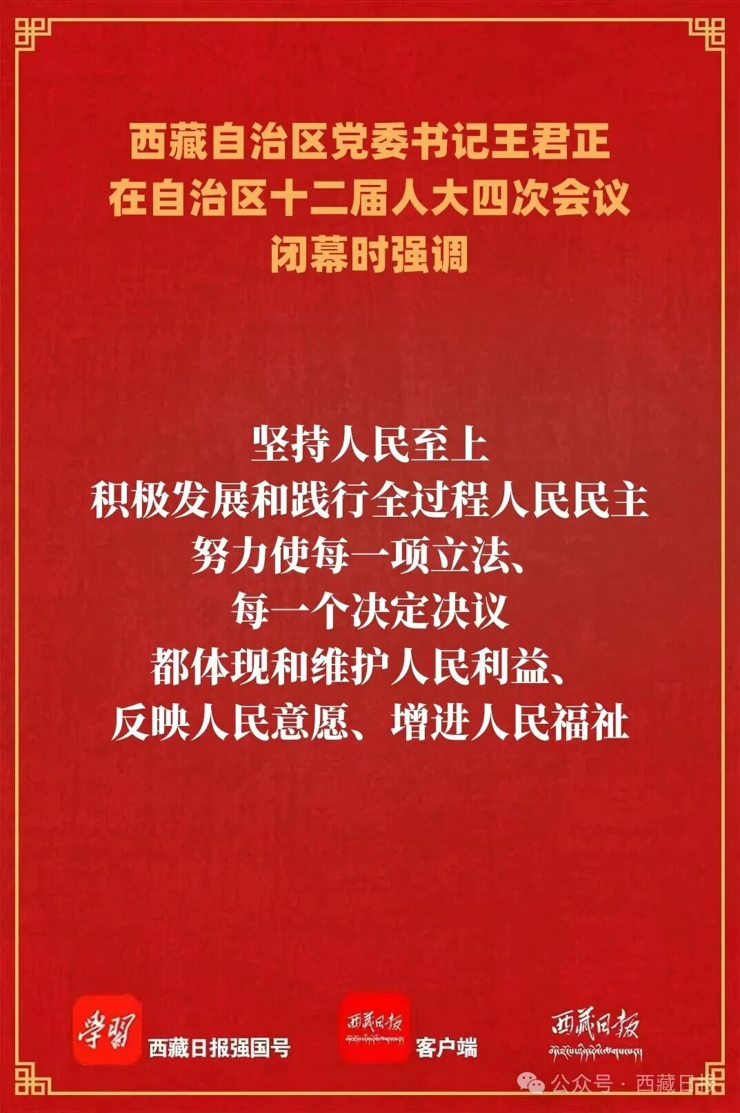 王君正指出,自治区十二届人大四次会议是一次高举旗帜、凝心聚力、团结奋进的大会。会议期间,与会代表以饱满的政治热情,聚焦党中央决策部署和自治区党委工作安排,聚焦未来五年西藏经济社会发展,聚焦人民群众所思所盼所想,依法履职尽责,积极建言献策,展现了新时代西藏人大代表的良好精神风貌和使命担当。与会代表高度评价了“十四五”时期西藏经济社会发展取得的重大成就,一致认为,在以习近平同志为核心的党中央坚强领导、关心重视下,自治区党委团结带领全区各族干部群众,经过五年不懈努力,推动西藏经济社会持续快速发展,社会主义现代化新西藏建设迈出了坚实步伐、站在了新的历史起点上。与会代表充分肯定了2025年全区经济社会发展取得的成绩,一致认为,2025年是西藏发展历程中极不平凡的一年,习近平总书记率中央代表团出席自治区成立60周年庆祝活动,听取自治区党委和政府工作汇报并发表重要讲话,这在党和国家历史上是第一次,极大鼓舞了全区各族人民共建中华民族共同体、书写美丽西藏新篇章的信心决心;全区各级党委、政府坚持以习近平总书记视察西藏时的重要讲话精神统一全区广大干部群众思想,坚持稳中求进工作总基调,统筹兼顾,持之以恒推动稳定、发展、生态、强边四件大事落实,着力保稳定、抓经济、促发展,各项事业不断取得新进步。与会代表深刻认识到,习近平总书记关于西藏工作的重要指示英明正确,新时代党的治藏方略完全符合西藏实际,只要我们坚定不移沿着习近平总书记指引的方向奋勇前进,只要我们不折不扣把党中央各项决策部署贯彻好落实好,西藏经济社会发展就会不断从胜利走向新的胜利。